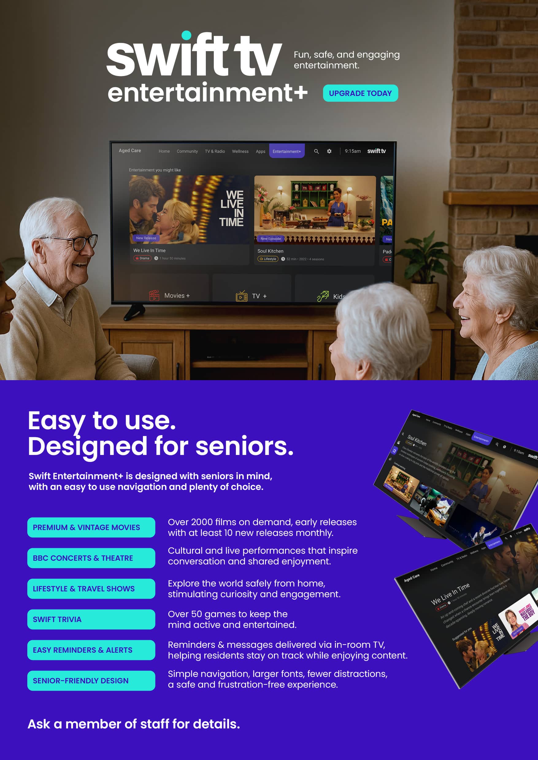 Click below to download a digital leaflet to share with residents’ families about the benefits of upgrading their subscription to include Swift Entertainment.